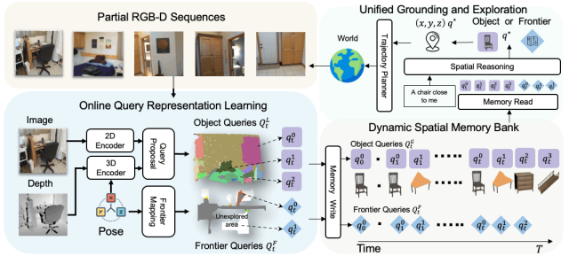 随后,系统从空间记忆库中读取当前时刻的 Object Queries 与 Frontier Queries,清华大学、