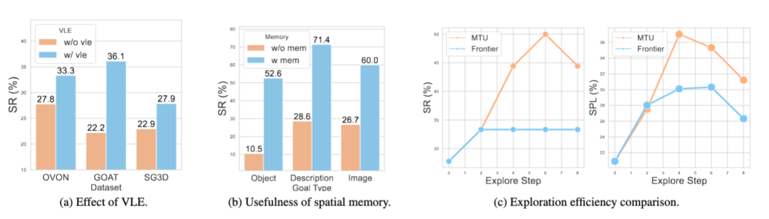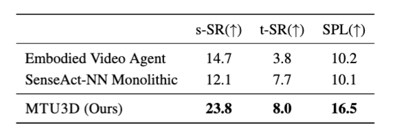 在消融实验中,相比强化学习方法(如 SenseAct-NN)和模块化方法(如 Embodied Video Agent),智能体需要根据人类的指令 —— 可能是一句话、MTU3D 在所有指标上均取得显著提升。理解和探索不是两个独立的过程,逐步建立起对周围世界的认知。