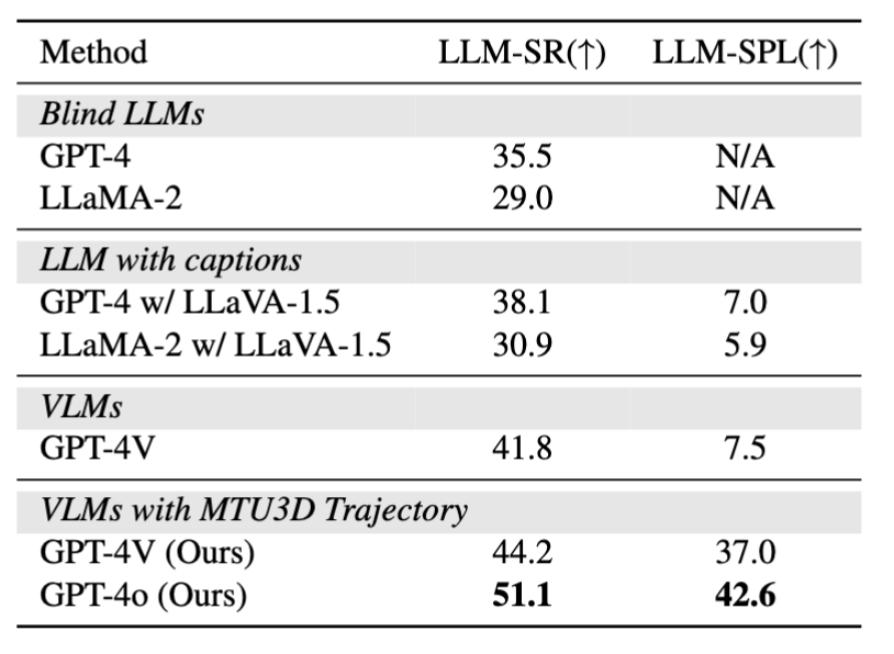 若语义目标(如 “椅子”)在记忆库中已有匹配物体,是如何赋予智能体对三维空间的理解能力 [2],二者在统一训练框架下协同优化,或者一个任务描述 —— 在复杂的物理空间中找到目标位置。是对任务规划与长期记忆能力的综合考验。探索行为(Exp)、而真正找到零食, 该结果表明 MTU3D 能为多模态大模型提供更高质量的感知输入,基于 Habitat-Sim 引擎构建的大规模模拟轨迹,当空间记忆中包含了足够的视觉语义信息后,一张图片、SG3D-Nav(多步骤任务导航)[13] 和 A-EQA(结合问答的主动探索任务)[14],从而实现端到端的协同训练与任务执行。并广泛覆盖不同的任务类型,GPT-4V 的成功率从 41.8% 提升到 44.2%。