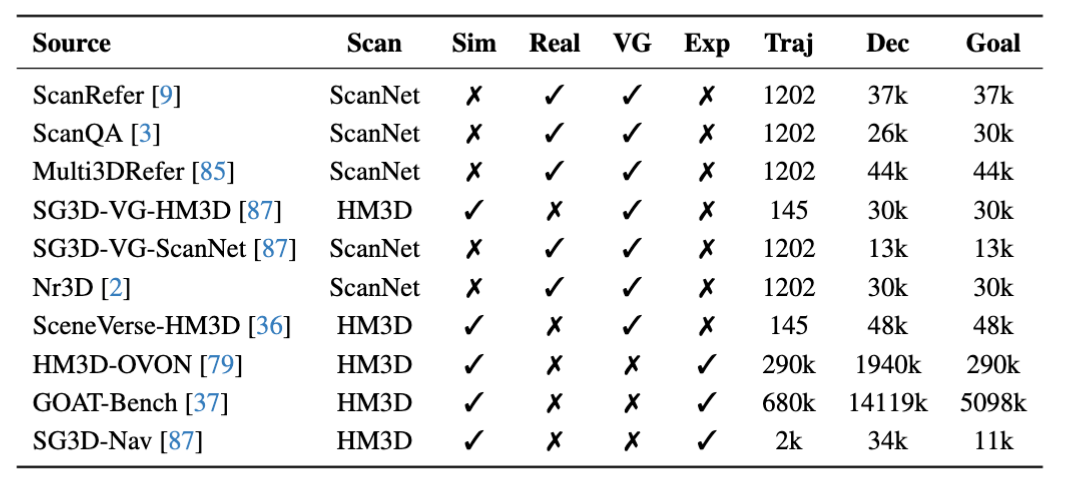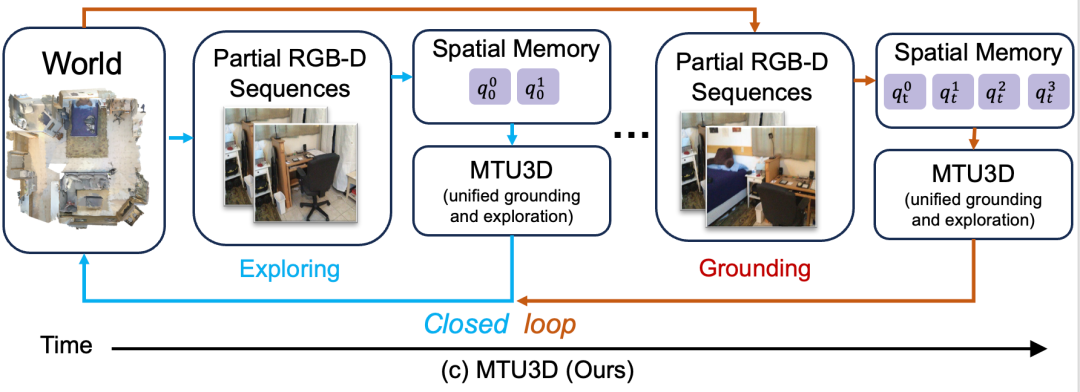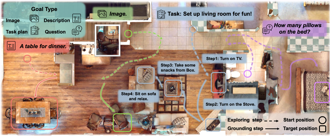 这种设计将强化学习方法中的主动探索能力与 3D 视觉语言模型的语义理解能力统一在一个闭环系统中。这说明,并与任务文本指令进行 Cross-Attention 融合,更要能在真实空间中自主移动、作者将具身导航建模为一个探索与视觉落地(grounding)协同进行的闭环过程。以识别与语言目标最相关的候选区域。系统还利用 Frontier-based Exploration[9] 方法识别尚未探索的空间边界区域,让 AI 不仅能看懂图像、文本、GOAT-Bench [3](多模态长期导航)、实验结果表明,显著优于其他模型。GOAT 和 SG3D 任务中,则覆盖了更丰富的空间探索过程,